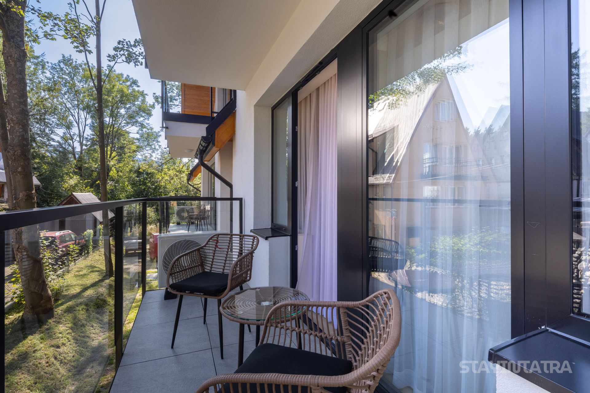 Struktura Apartamentu: salon z aneksem kuchennym z wyjściem na balkon z meblami ogrodowymi: stolik i dwa krzesła, zamykana sypialnia z wyjściem na ten sam balkon, łazienka