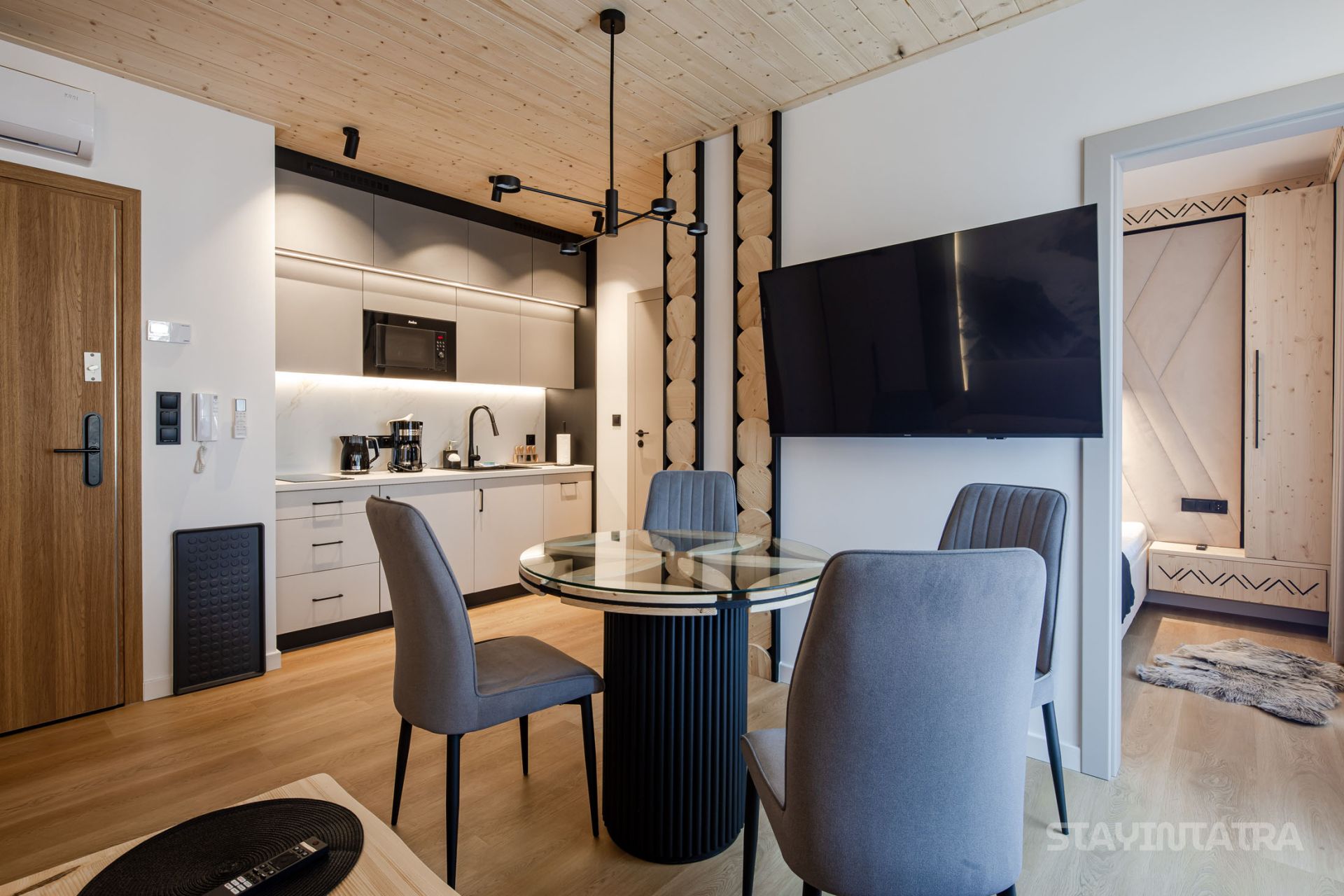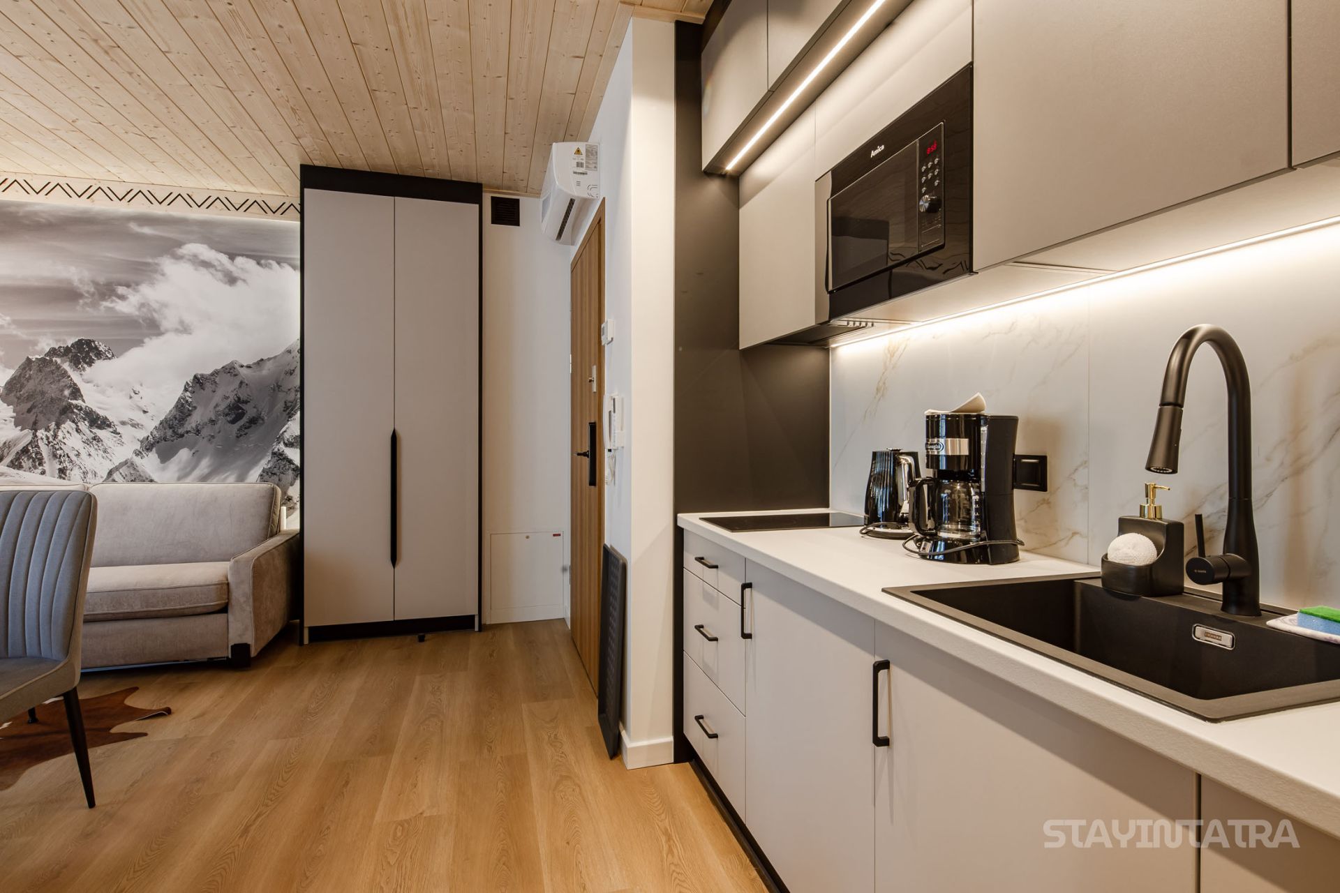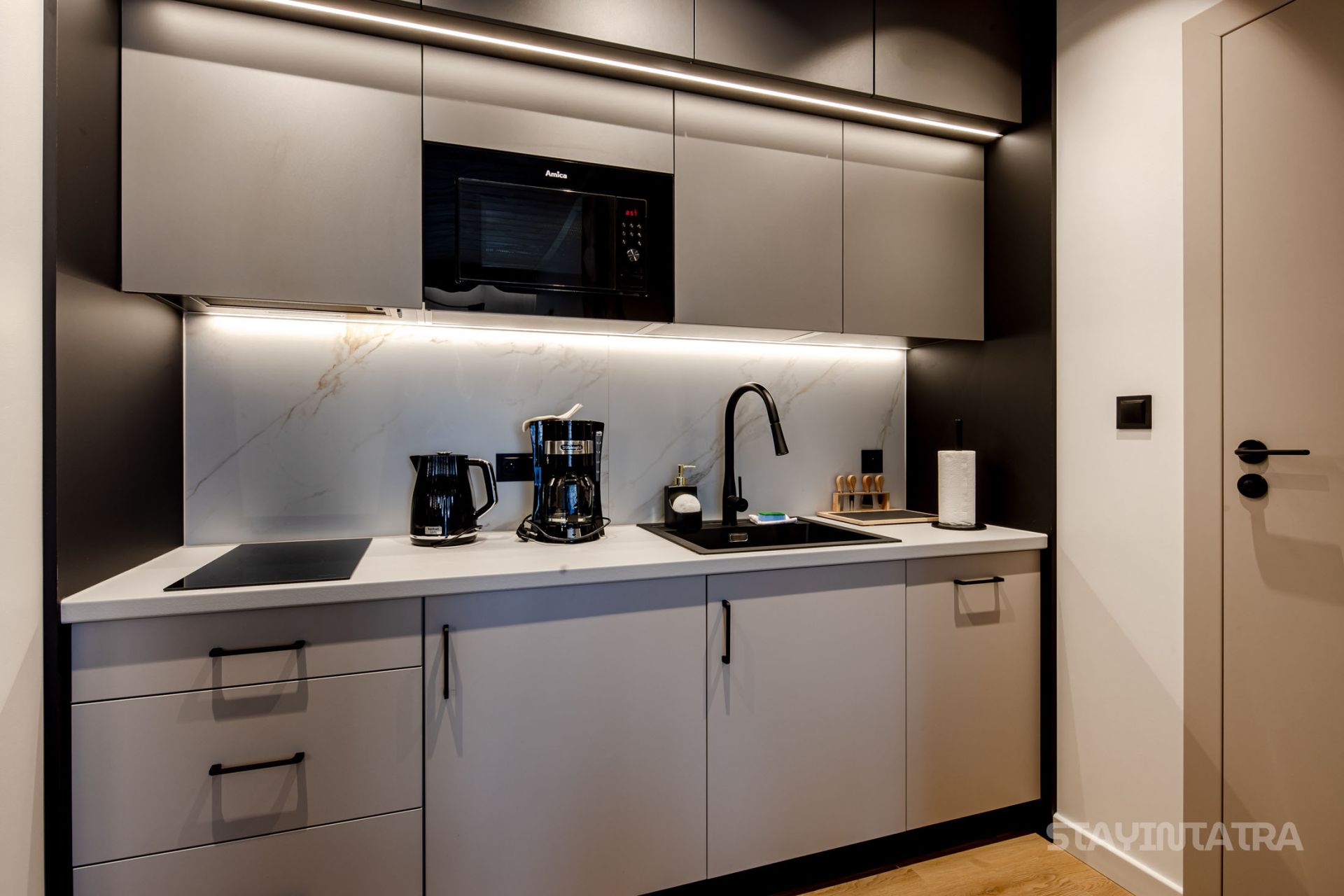 Aneks kuchenny: dwupalnikowa płyta indukcyjna, lodówka, zmywarka, mikrofalówka, czajnik elektryczny, ekspres do kawy DeLonghi przelewowy, zastawa ceramiczna oraz szklana, sztućce, garnki, patelnie, akcesoria do gotowania, okrągły stół i 4 krzesła