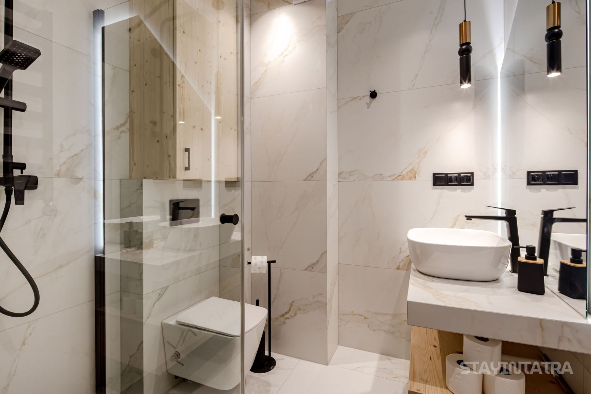 Łazienka: kabina prysznicowa, toaleta, umywalka, lustro, duża szuflada, suszarka do włosów